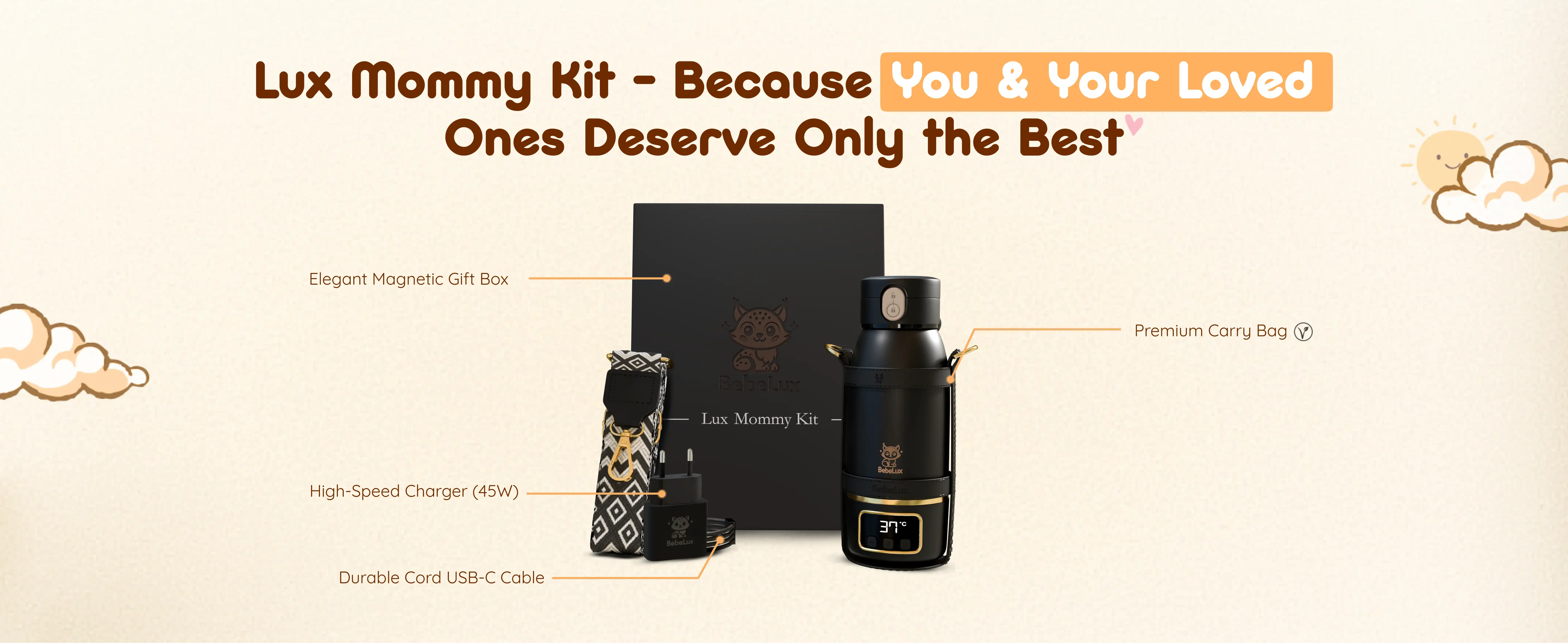 The BebeWarm V2 is now available in 2 sets – both ready to use, with no extra purchases required: - Standard Set: BebeWarm V2 Baby Bottle Warmer + USB-C Cable + 35W Power Adapter - Lux Mommy Kit: BebeWarm V2 Baby Bottle Warmer + USB-C Cable + 45W Fast Charging Power Adapter + Stylish Carrying Case , packaged in a premium gift box